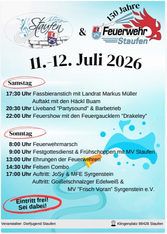 Home Termine 150 Jähriges Gründungsfest FF Staufen 11.07.2026 00:00 bis 12.07.2026 00:00 Kreisfeuerwehrverband 150 - Jähriges Gründungsfest Fest Staufen 11-12.07.2026.jpg Zu Kalender hinzufügen